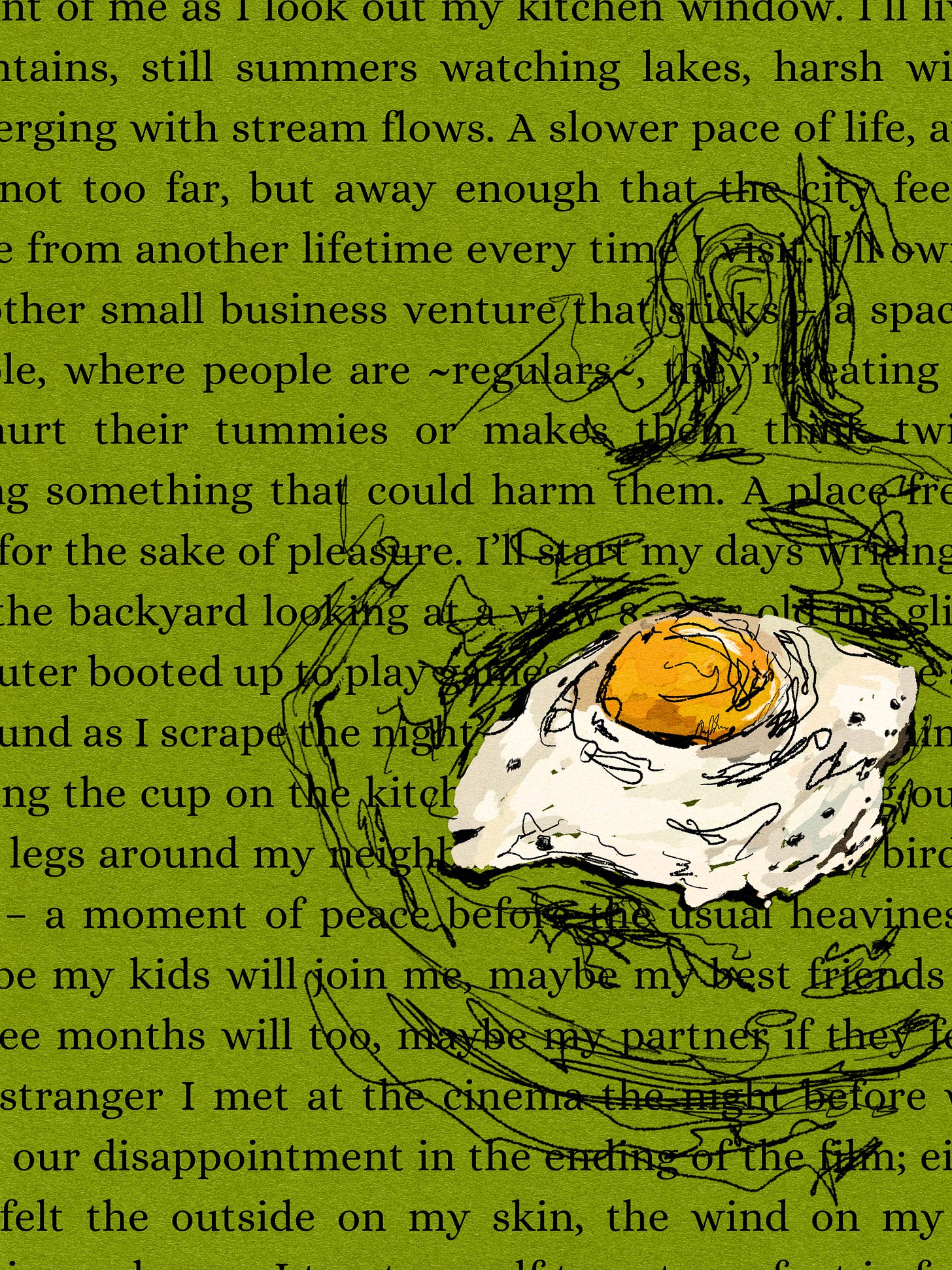 My dream is to live by a large body of water, endless sea stretched out in front of me as I look out my kitchen window. I’ll live amidst the mountains, still summers watching lakes, harsh winters my breath merging with stream flows. A slower pace of life, away from the city, not too far, but away enough that the city feels like an adventure from another lifetime every time I visit. I’ll own a coffee shop, another small business venture that sticks – a space that’s a local staple, where people are ~regulars~, they’re eating food that doesn’t hurt their tummies or makes them think twice about consuming something that could harm them. A place free of self-sabotage for the sake of pleasure. I’ll start my days writing morning pages in the backyard looking at a view 8-year old me glimpsed as the computer booted up to play games on Miniclip. Coffee set on the stone ground as I scrape the night’s thoughts from my mind; and I’ll rise, leaving the cup on the kitchen counter, venturing outdoors to move my legs around my neighbourhood, to hear the birdsong and meditate – a moment of peace before the usual heaviness sets in. And maybe my kids will join me, maybe my best friends that visit every three months will too, maybe my partner if they feel like it, maybe a stranger I met at the cinema the night before where we mumbled our disappointment in the ending of the film; either way, I’d have felt the outside on my skin, the wind on my face, the tiredness in my legs as I trust myself to put one foot in front of the other, a testament to moving forward, where my teens and twenties felt like my legs were constantly buried in sand struggled. One foot, one foot, one foot, then the other.